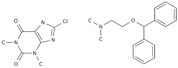 Dimenhydrinate, also known as diphenhydramine/8-chlorotheophylline salt and sold under the brand names Dramamine and Gravol, among others, is an over-the-counter medication used to treat motion sickness and nausea. Dimenhydrinate is a theoclate salt composed of diphenhydramine and 8-chlorotheophylline (a theophylline relative) in a 1:1 ratio.[3]